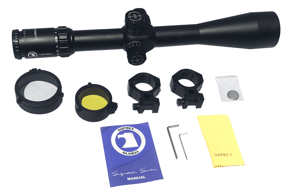 Osprey’s first focal plane variable scope places the etched glass reticle at the front of the erector assembly allowing the values of the reticle to remain in proportion throughout the magnification. The Elite Series 3-30×56 has a sleek design with exposed locking target turrets, an illuminated reticle, and is MOA to MOA for ease of use. This scope comes with triple duty aluminum rings, see-through flip-up dust covers, and is backed by Osprey’s industry leading no-nonsense lifetime warranty.